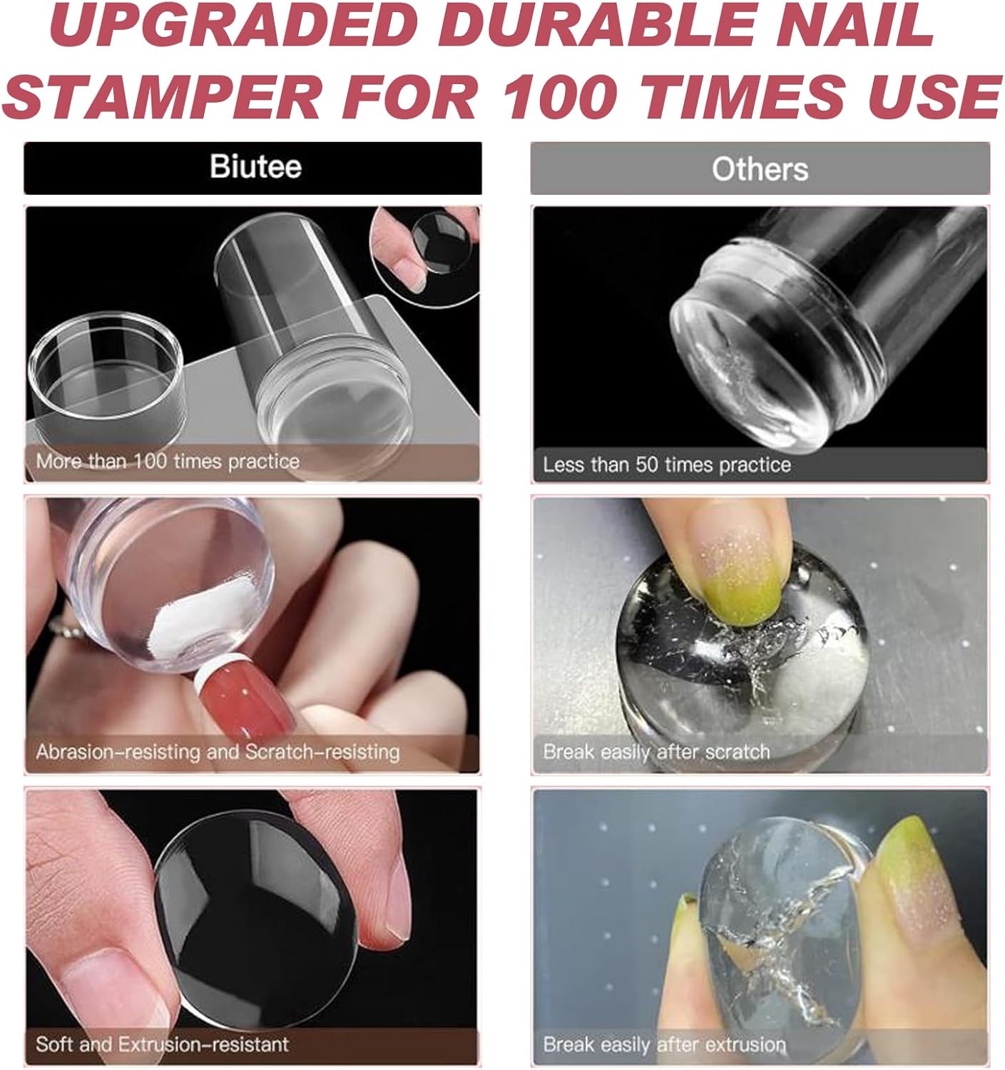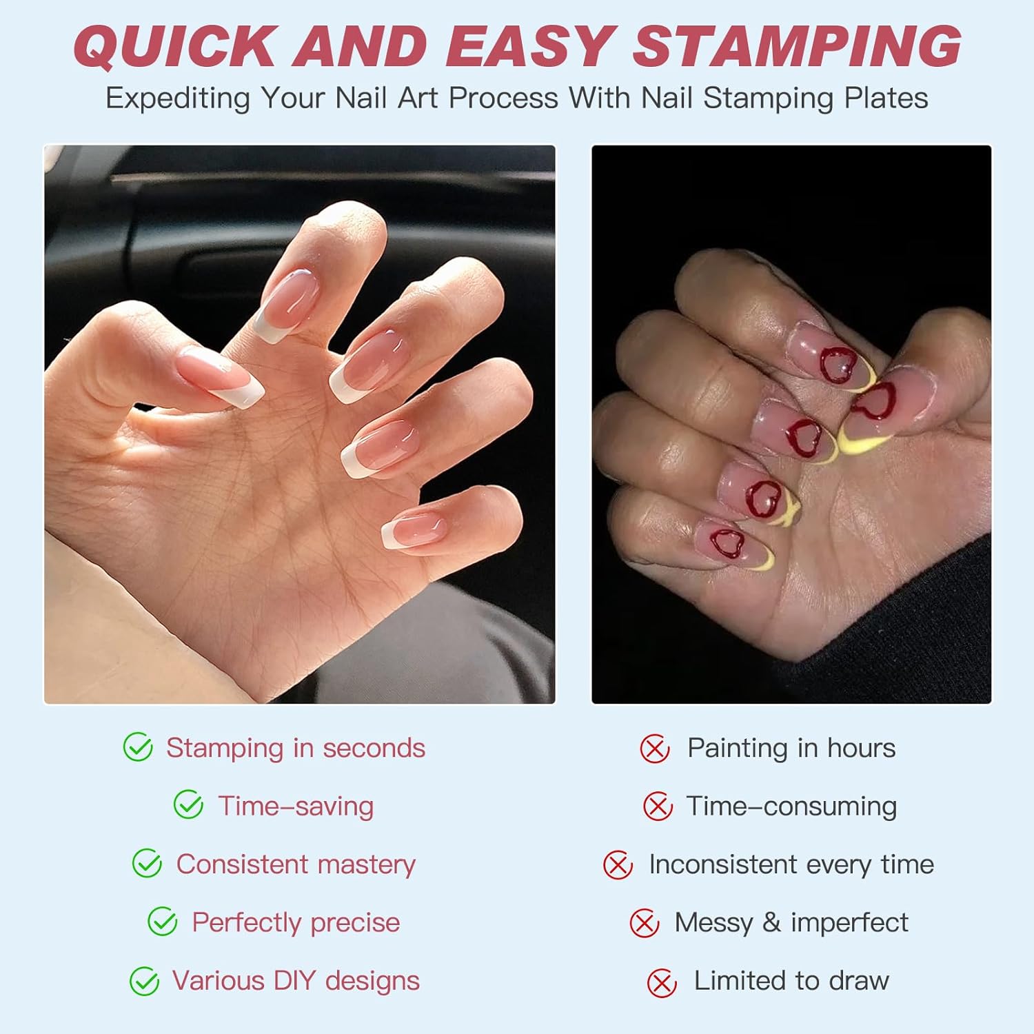 - 【Nail Stamping Kit】The nail stamper plate set include 2pcs nail stamp plates, 1pc nail art stamper, 1pc replaceable transparent nail stamper head, 1pc nail scraper. The ideal gift for your girl, mother, friend, nail professionals and DIY nail art lovers.